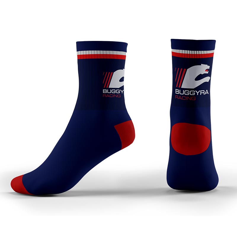 Ponožky s motivem Buggyra Racing, barva tmavě modrá. Složení 75% bavlna, 20% polyamid, 5% elastan